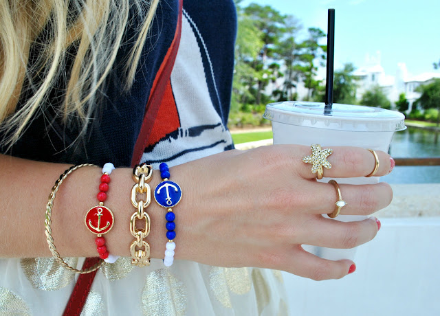 Nautical accents perfectly encompass the essence of summer, which is why I've been on a perpetual hunt for all things nautical ever since winter ended. From sailboats to anchors, nothing screams salt life like a fabulous nautical print. The latest addition to my growing collection, are these adorable anchor pendant beaded bracelets, which were too cute not to stack on together.